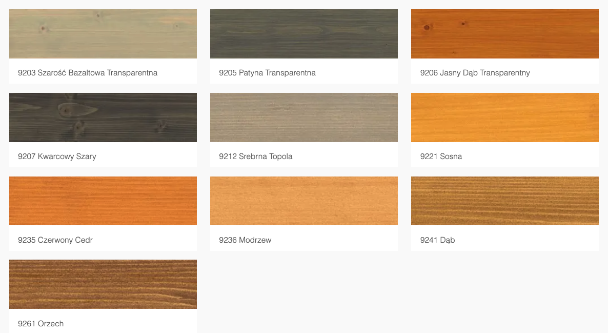 - Kolor finalny zależy od rodzaju drewna, sposobu jego wyszlifowania, suszenia, sposobu malowania. Próbki robiono na drewnie sosnowym. Przedstawione kolory mogą się różnić od rzeczywistych w zależności od monitora na którym są wyświetlane.