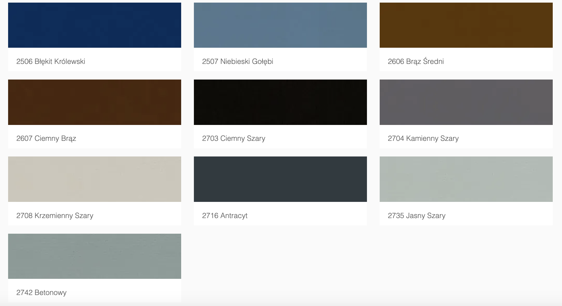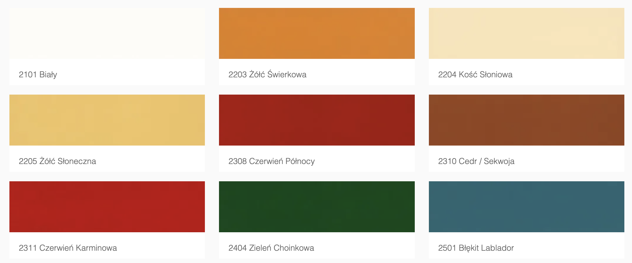 - Kolor finalny zależy od rodzaju drewna, sposobu jego wyszlifowania, suszenia, sposobu malowania. Próbki robiono na drewnie sosnowym. Przedstawione kolory mogą się różnić od rzeczywistych w zależności od monitora na którym są wyświetlane. W zależności od koloru czas oczekiwania może się wydłużyć.