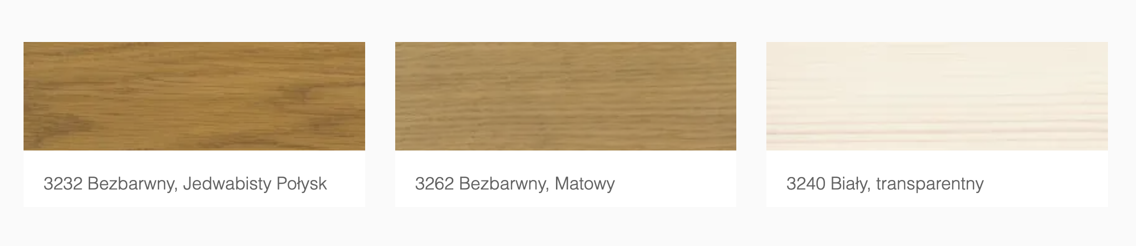 - Kolor finalny zależy od rodzaju drewna, sposobu jego wyszlifowania, suszenia, sposobu malowania. Próbki robiono na drewnie sosnowym. Przedstawione kolory mogą się różnić od rzeczywistych w zależności od monitora na którym są wyświetlane.