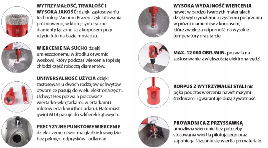 - Wysoka wydajność wiercenia nawet w bardzo twardych materiałach dzięki wytrzymałemu i czystemu połączeniu w próżni diamentów z korpusem, które zwiększa odporność na wysokie temperatury oraz tarcie.