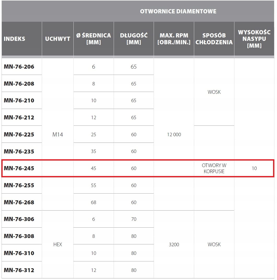 - Wiercenie na sucho dzięki umieszczonemu w środku otwornic woskowi, który podczas wiercenia topi się i chłodzi część roboczą diamentów.