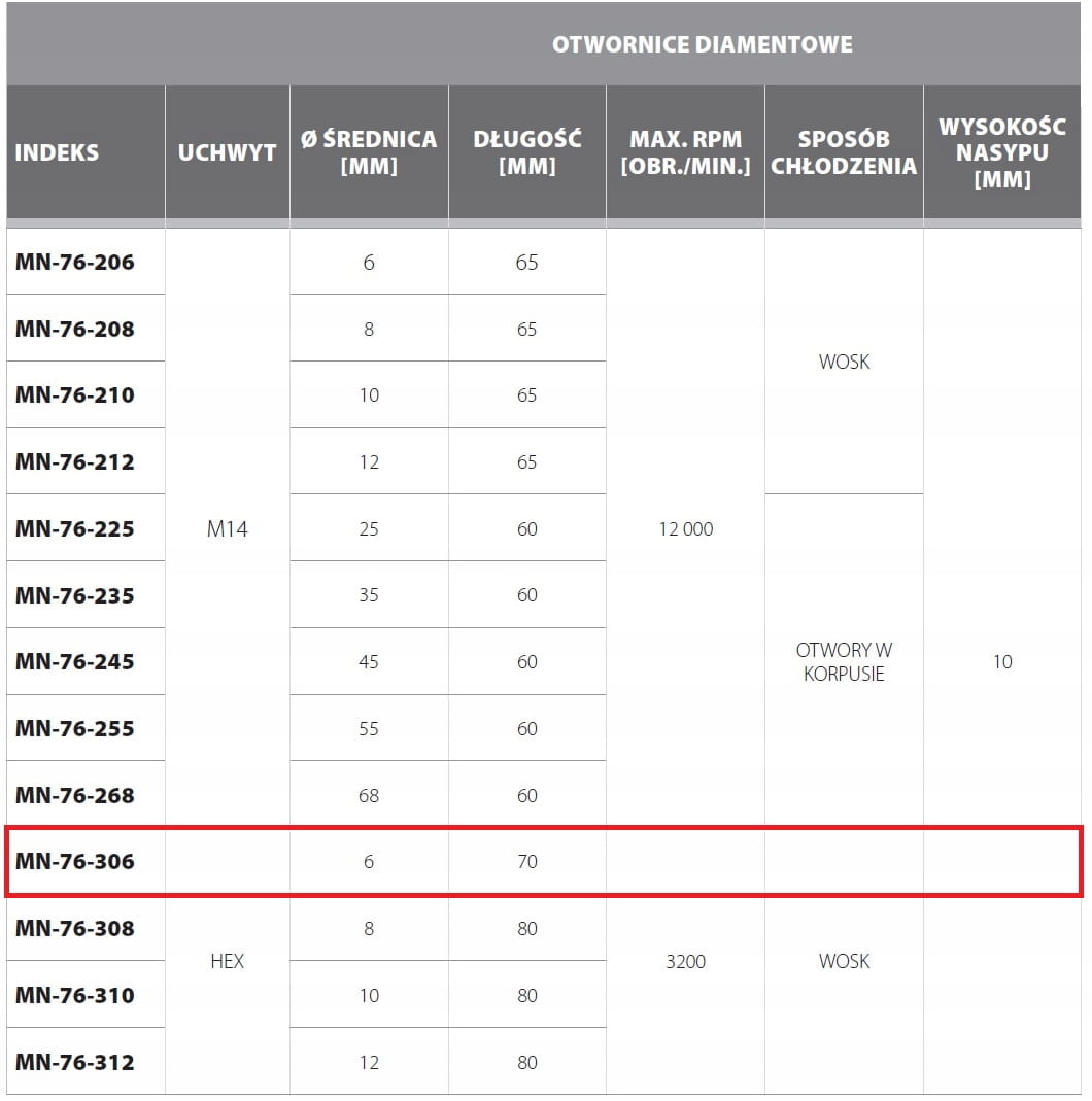 - Wiercenie na sucho dzięki umieszczonemu w środku otwornic woskowi, który podczas wiercenia topi się i chłodzi część roboczą diamentów.