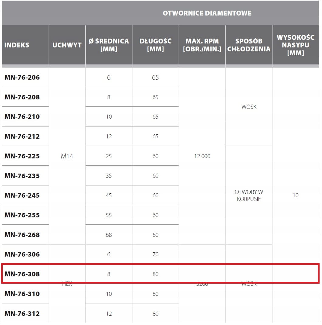 - Wiercenie na sucho dzięki umieszczonemu w środku otwornic woskowi, który podczas wiercenia topi się i chłodzi część roboczą diamentów.