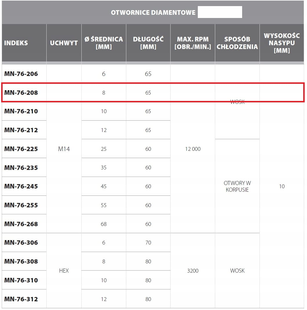 - Wiercenie na sucho dzięki umieszczonemu w środku otwornic woskowi, który podczas wiercenia topi się i chłodzi część roboczą diamentów.