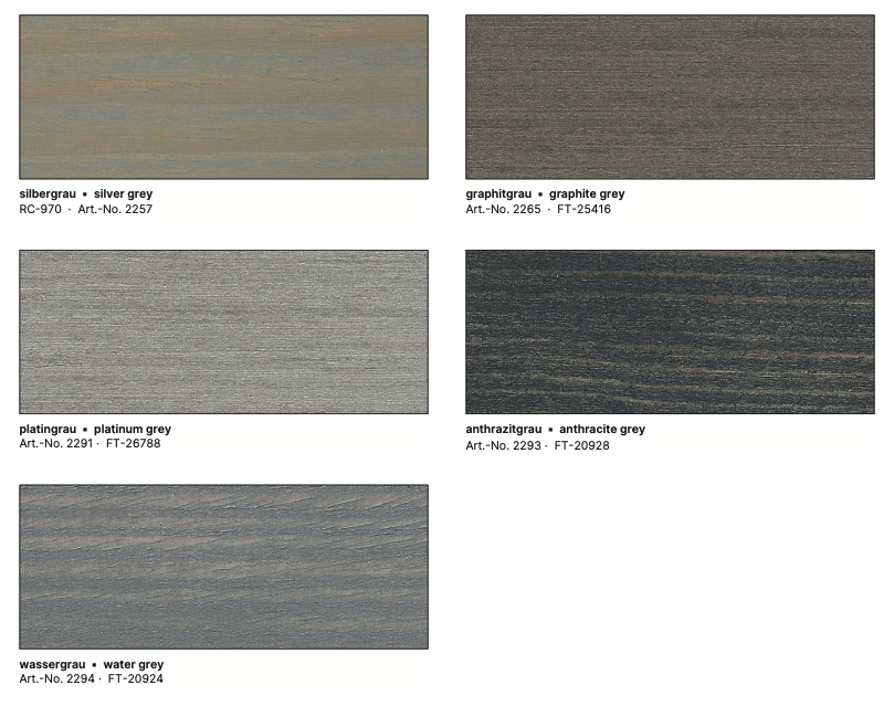 Dostępne kolory standardowe to: pinia/modrzew, teak, kasztan, ciemnozielony, mahoń, palisander, bezbarwny, orzech, sosna, dąb rustykalny, dąb jasny, hemlok, biały, heban, zieleń solna, srebrnoszary, grafitowy, platynowy, antracytowy, szary wodny. W galerii znajduje się wzornik kolorów :)