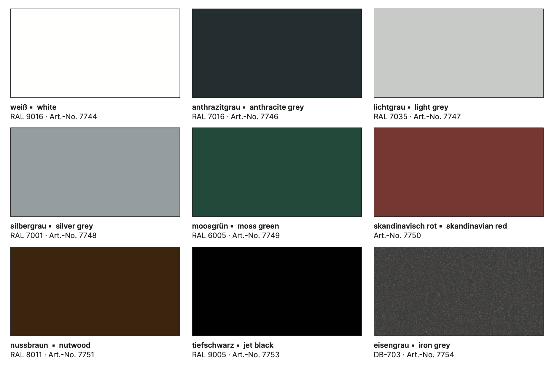 - Biały, Antracytowy, Jasnoszary, Srebrnoszary, Zieleń mchu, Czerwień skandynawska, Orzechowy, Głęboka czerń, Stalowoszary,