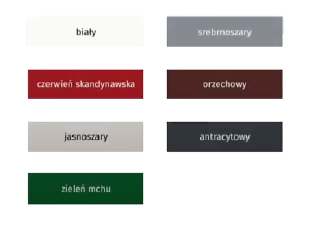 - Biały, Antracytowy, Jasnoszary, Srebrnoszary, Zieleń mchu, Czerwień skandynawska, Orzechowy, Głęboka czerń, Stalowoszary,