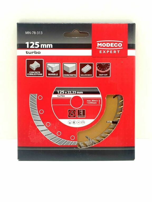 - Specjalny kształt segmentów typu Turbo umożliwia bardzo szybkie cięcie kostki brukowej, betonu i innych twardych materiałów budowlanych